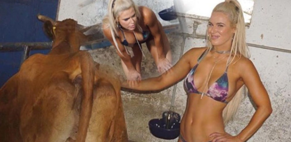 Während Rusev gekonnt die Euter einer Kuh bearbeitete, stand Lana interessiert - natürlich im Bikini - daneben. Aufmerksame Beobachter bemerkten, dass das Stück Stoff nicht die ganze Brust von Lana überdeckte. Die Wrestlerin reagierte prompt und löschte das Bild sofort von Instagram.