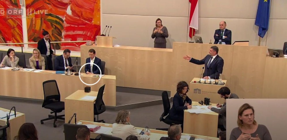 "Nehmen S' das Handy, rufen S' den Kickl an und fragen S' wo er ist, vielleicht?", fordert Leichtfried den Kanzler auf der Regierungsbank zunächst auf (siehe Video oben bei 0:58). In diesem Moment besprach Kurz gerade etwas auf seinem mit einem herbeigeeilten Mitarbeiter und nahm Leichtfrieds Wortmeldung nicht zur Kenntnis.