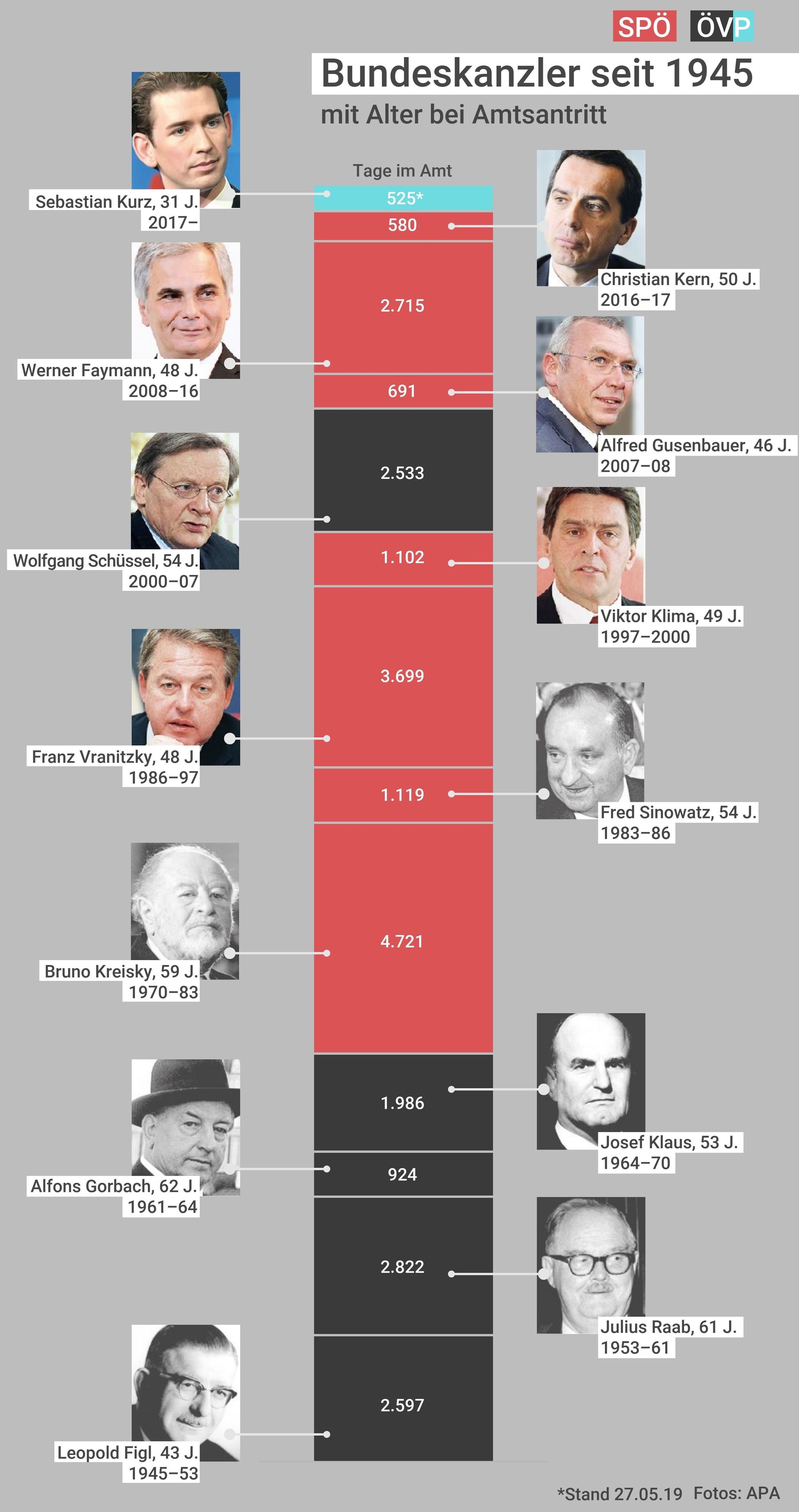 Kanzler Kurz war damit der kürzestdienende Bundeskanzler der Zweiten Republik. Nur 525 Tage war er seit seiner Angelobung am 17. Dezember 2017 im Amt. Platz Zwei in diesem Ranking hat Christian Kern inne, der war 580 Tage im Amt.