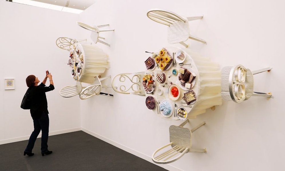 Zu sehen gab’s die schräge Essenssause bis Sonntag bei der Londoner Messe "Frieze". Schaum, Plastik, Klebstoff und Farbe tricksen die Schwerkraft auf einer Fläche von 2,4 x 2,4 Meter aus. Ein echter optischer Leckerbissen!