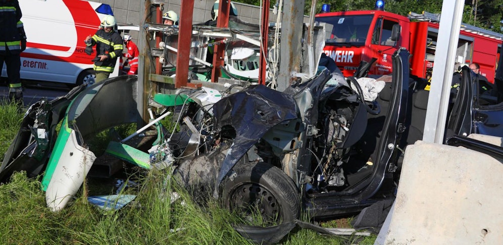 Der mitgeführte Anhänger schleuderte bei dem Aufprall auch noch mit voller Wucht gegen das Heck des Fahrzeugs. Der Lenker aus der Nähe von Innsbruck sowie die Beifahrerin (62) wurden eingeklemmt und mussten von der Feuerwehr aus dem Wrack geschnitten werden.
