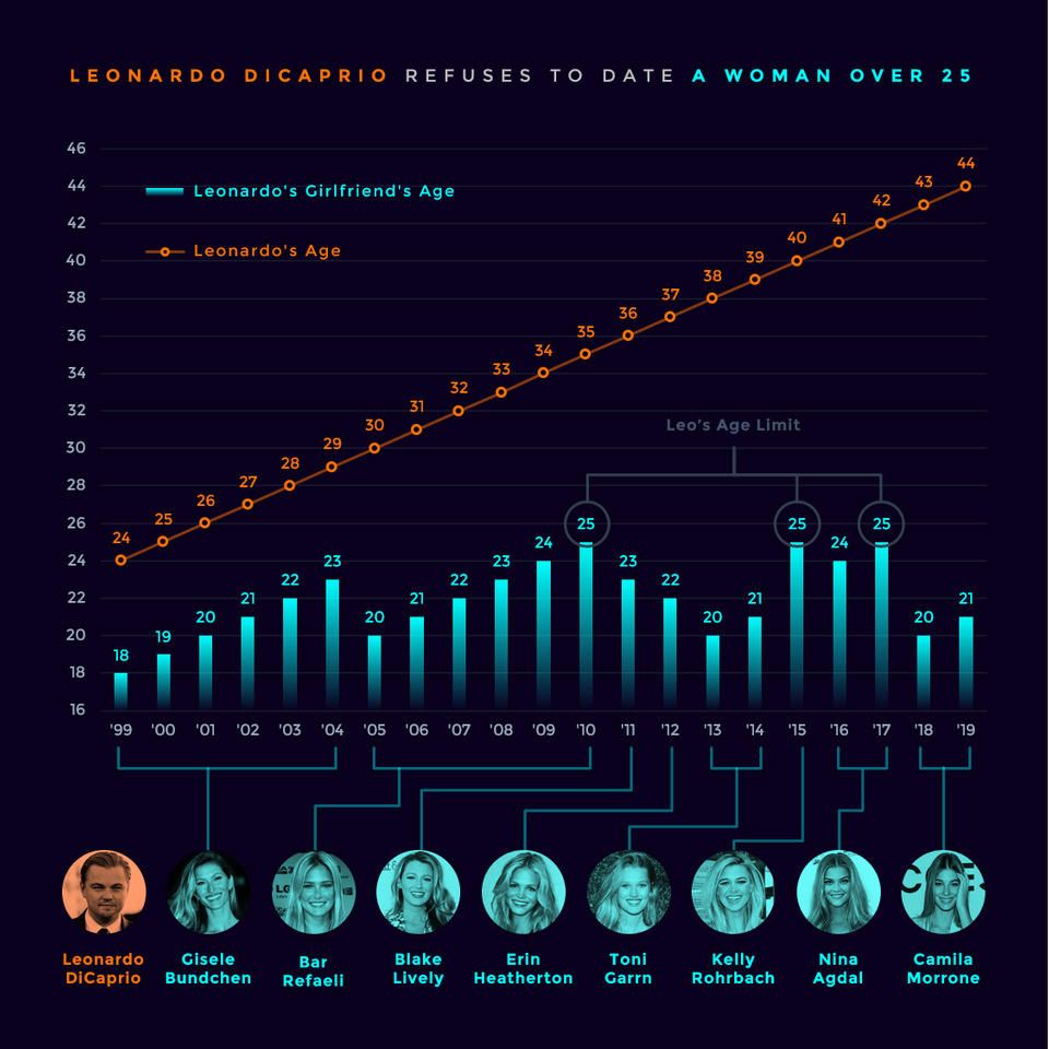 Leonardo DiCaprio (44) wird älter – was die Liebe betrifft, scheint er an Gleichaltrigen aber nicht interessiert zu sein. Auf Reddit macht eine Grafik (siehe unten) die Runde, die enthüllt: Keine seiner acht Freundinnen war älter als 25. Denn spätestens als die Frauen an der Seite des Schauspielers die Mitte Zwanzig erreichten, zerbrach die Beziehung.