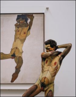 In siebenstündiger Arbeit und mit tatkräftiger Hilfe von Bodypainterin Manuela Rosa Maderthaner erwachte der Kult-Expressisonist in Gestalt von Modell Sebastian Berchtold zum Leben, am Abend ging's dann durch die City Richtung Rathausplatz.