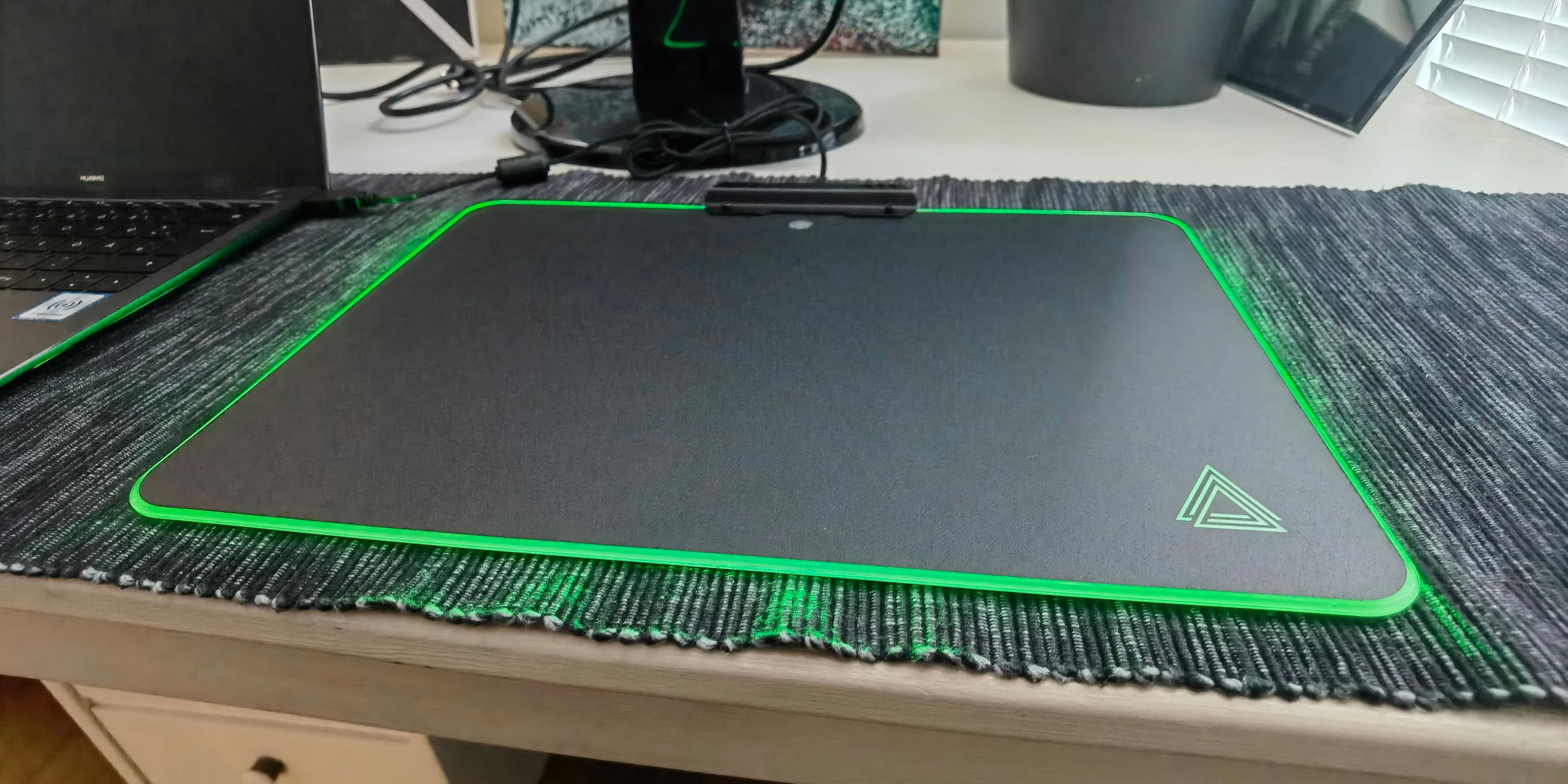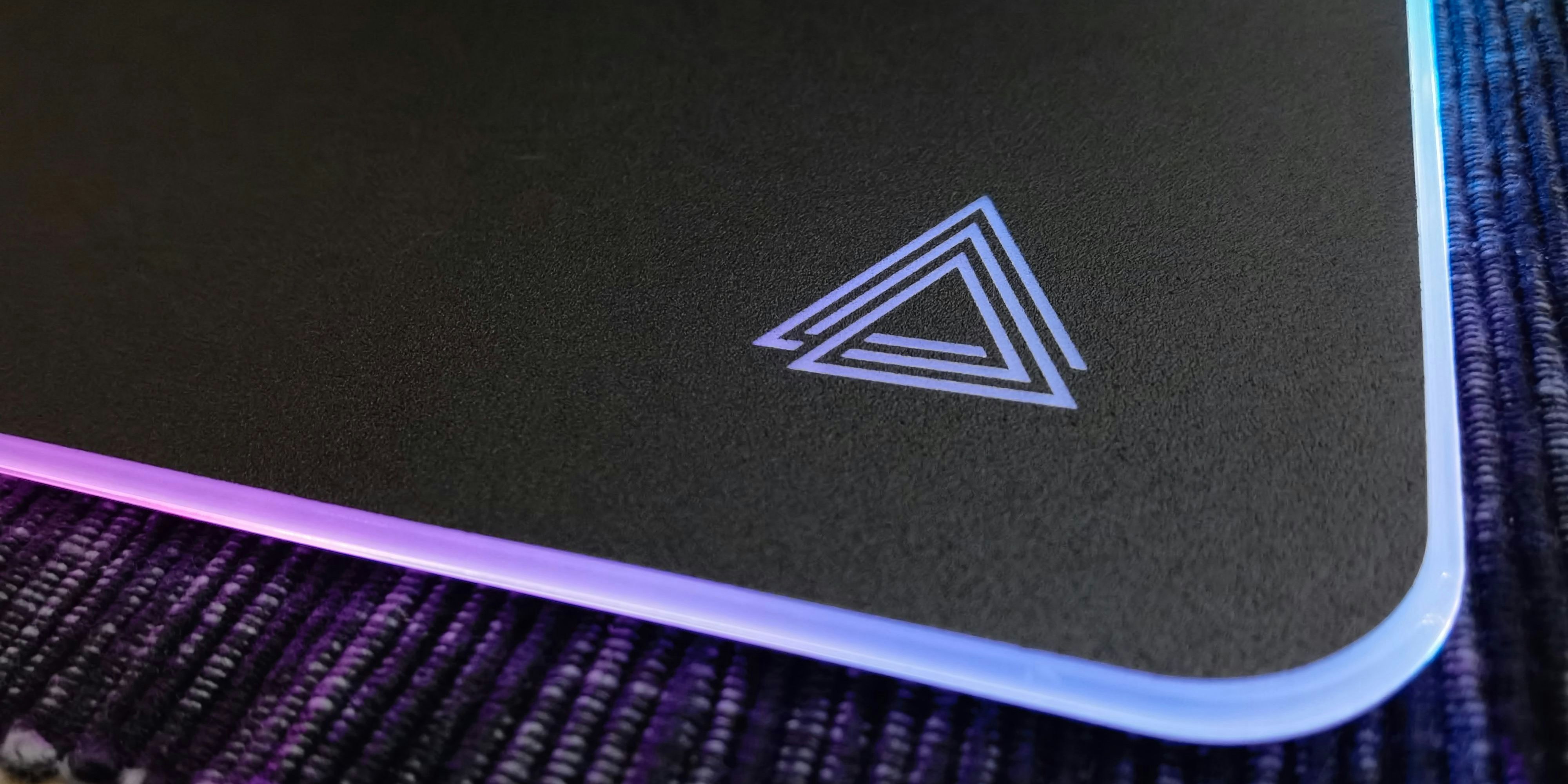 Das Fingerprint-Symbol am Mauspad dient der Steuerung der Beleuchtung. Dabei stehen sieben anpassbare Farben von Grün über Blau bis Rot ebenso zur Verfügung wie drei Beleuchtungsmodi von einfärbig über ein pulsierendes buntes LED-Licht bis hin zu einem Neon-Lauflicht. Natürlich gibt es auch die Möglichkeit, die Beleuchtung komplett abzuschalten. Die LED-Leisten ziehen sich um die Ecken und über die Kanten des Mauspads, beleuchtet ist auch das Marken-Logo in einer der Ecken.