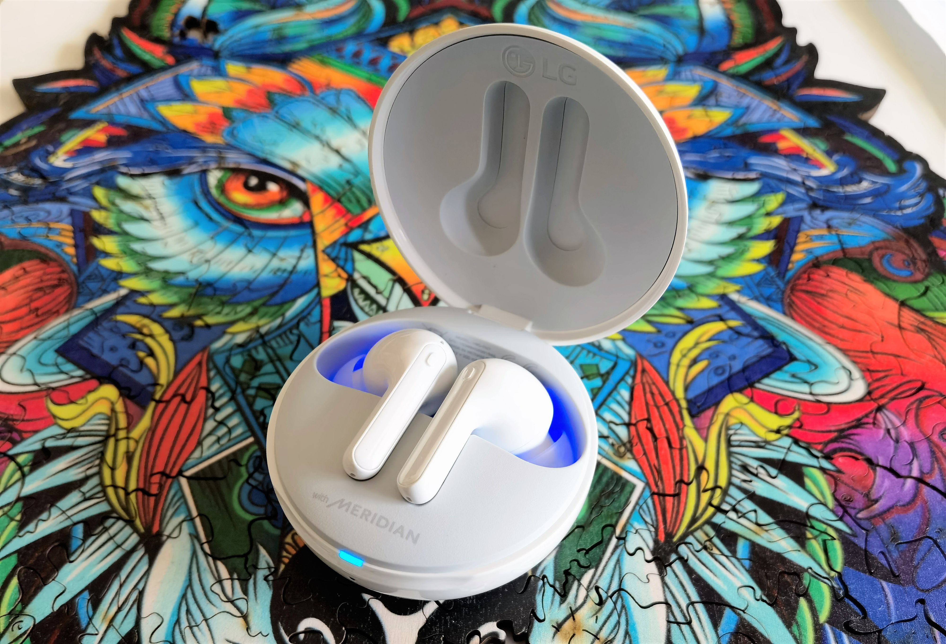 Eine Besonderheit, mit der sich die LG Tone Free FN7 von Mitbewerbern absetzen, ist auch eine UV-Reinigung. Werden die Kopfhörer in den Ladebehälter gelegt und wird der Deckel geschlossen, schalten sich LEDs mit UV-Licht ein, um Bakterien auf den Silikonaufsätzen abzutöten. Laut LG sollen so innerhalb von zehn Minuten 99,9% der E. Coli- und S. aureus-Bakterien auf den Lautsprechermembranen der Earbuds beseitigt werden. Nicht reinfallen darf man dabei auf das blaue Licht, das aus dem Etui strahlt, wenn man es öffnet: Dabei handelt es sich um ein reines Stimmungslicht. Sieht aber immerhin sehr schick aus!