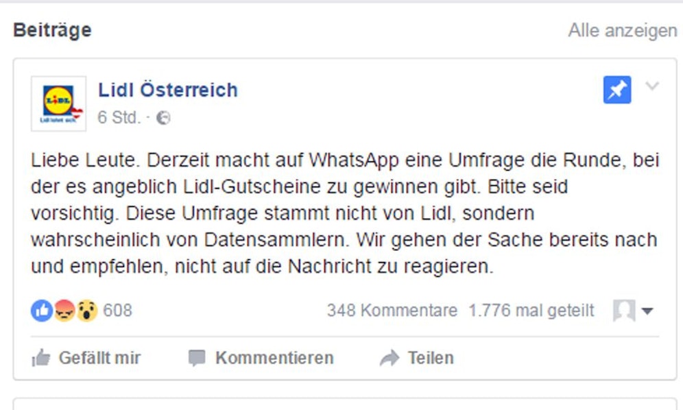"Liebe Leute. Derzeit macht auf WhatsApp eine Umfrage die Runde, bei der es angeblich Lidl-Gutscheine zu gewinnen gibt. Bitte seid vorsichtig. Diese Umfrage stammt nicht von Lidl, sondern wahrscheinlich von Datensammlern. Wir gehen der Sache bereits nach und empfehlen, nicht auf die Nachricht zu reagieren", so Lidl Österreich auf Facebook.