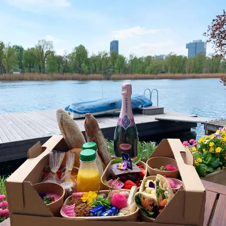 Wenn das Wetter mitspielt, dann könnt ihr nicht nur mit gutem Essen, sondern auch mit einer entspannten, frühlingshaften Location punkten: Das Bootshaus an der Alten Donau bietet speziell für Muttertag eine Brunchbox gefüllt mit Antipasti, Räucherlachs Wrap, Falafel, Pink Hummus, Tzatziki, Baguette, Landtmann’s Original Brioche, Landtmann’s Original Mini Gugelhupf, Schokokuchen, Marmeladen, Butter, frische Früchte, 0,2l Orangensaft und der hausgemachten Limonade.