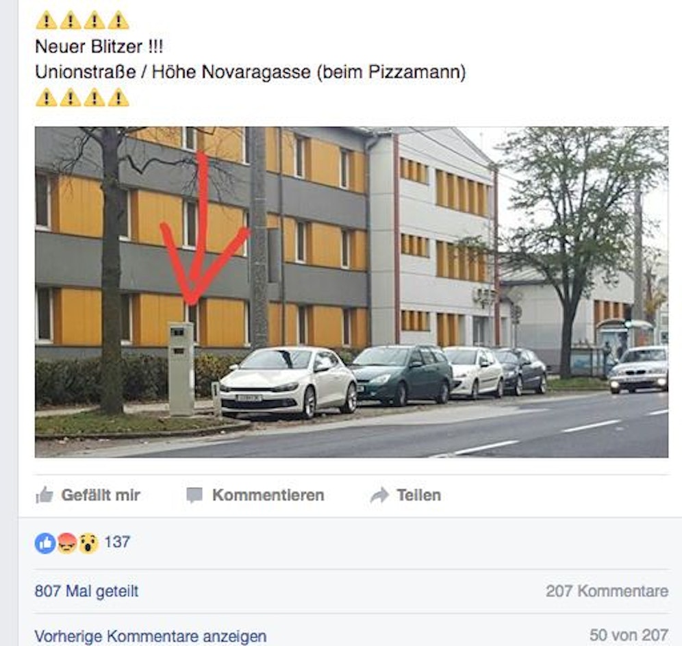Mit den Worten "Neues Blitz-Kastl" warnt eine Seite auf Facebook vor dem neuen Radar. Zu finden ist das Radar in der Unionstraße 33 gegenüber vom Pizzamann in Richtung Leonding (Bez. Linz-Land).