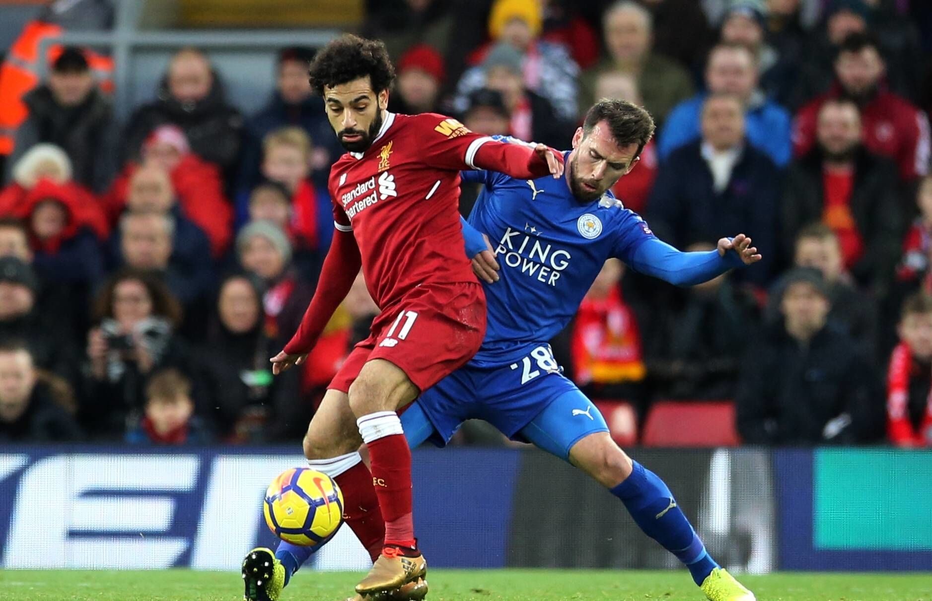 Christian Fuchs im Zweikampf mit Matchwinner Mo Salah, Bild:Imago