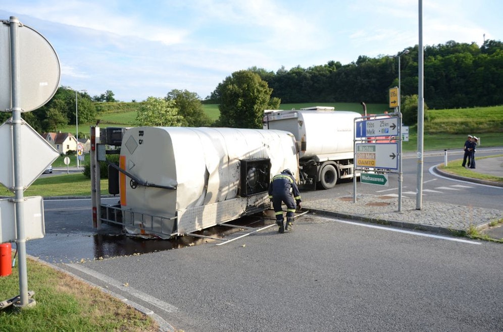 Am Dienstagabend kippte bei einem Kreisverkehr in Spielberg an der Pielach ein Lkw-Anhänger mit Bitumen um. Die Flüssigkeit verteilte sich auf der Fahrbahn und in der Kanalisation.