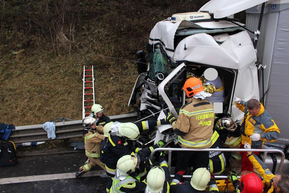 Schwerer Auffahrunfall zwischen zwei Sattelschleppern bei der A4-Abfahrt vom Airport Wien-Schwechat am Mittwochnachmittag: Der Lenker (56) des hinteren Lkw wurde dabei in der Fahrerkabine eingeklemmt und musste von der Feuerwehr befreit werden. Die Bergungsarbeiten waren mühsam, ein langer Stau die Folge.