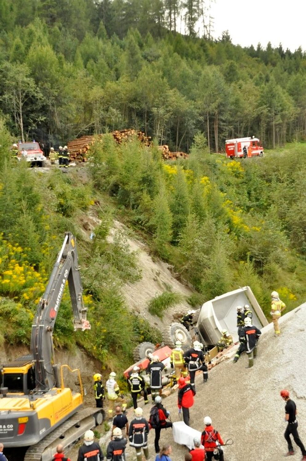 Der Wagen kam auf dem Dach zu liegen. Der 21-Jährige wurde im Führerhaus eingeklemmt und musste mit schwerem Bergegerät aus dem Wrack befreit werden. Er dürfte auf der Stelle tot gewesen sein. Die Arbeiter des Schotterwerkes mussten psychologisch betreut werden.