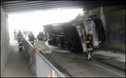 Alarm für die Feuerwehren im Bezirk St. Pölten am Gründonnerstag: Ein Lkw mit Diesel ist in einer Bahnunterführung umgekippt - Sperre der Westbahn.