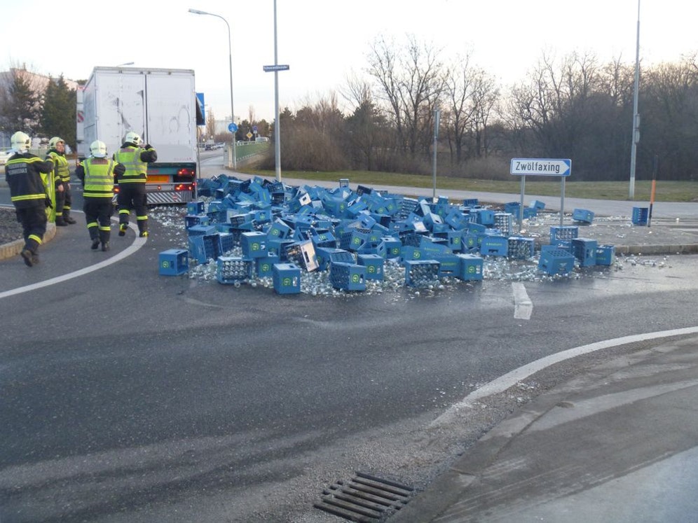 Mittwochfrüh musste die Feuerwehr Schwechat zu einem kuriosen Einsatz ausrücken. Ein Lastwagen einer Getränkefirma verlor beim passieren eines Kreisverkehrs an der Ecke Schwarzmühlstraße/ Brauhausstraße fast die komplette Ladung an Getränkekisten einer Mineralwasserfirma.