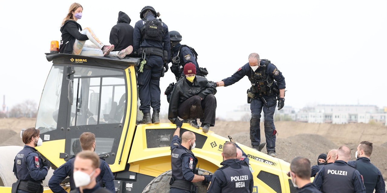 Zwei von ihnen hatten ihre Hände auf dem Dach eines Baggers in einem Eisenrohr fixiert und mussten von Seiltechnikern der Wega heruntergeholt werden. Zurück auf dem Boden, wurden sie von den Beamten weggetragen und später das Rohr aufgeschnitten. Die vier Umweltschützer wurden gemäß dem Versammlungsgesetz angezeigt. Da sich drei Aktivisten nicht ausweisen konnten, wurden sie vorläufig festgenommen.