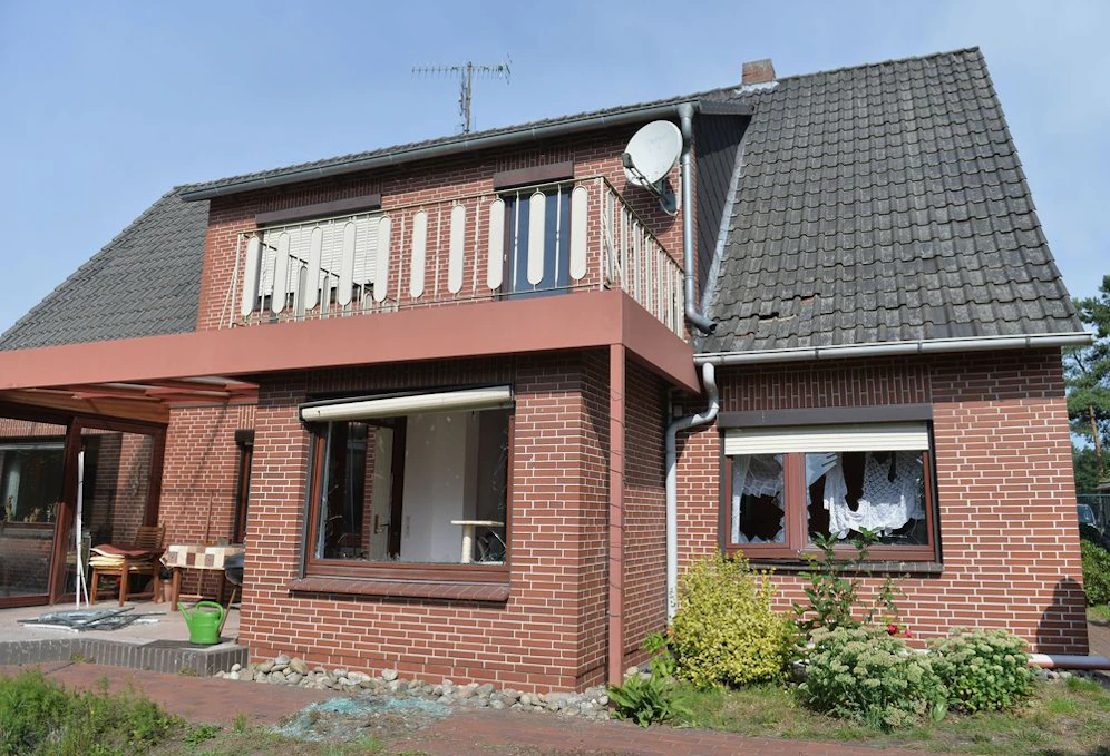 Dabei wurden nach Schilderung von einem Polizeisprecher sämtliche Türen aus der Verankerung gerissen, Fenster zerbarsten, die tragenden Wände erlitten Risse und Ziegel flogen vom Dach. Der Mann kam mit leichten Verletzungen ins Krankenhaus.
