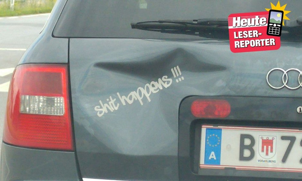 Anstatt den Schaden am Kofferraumdeckel vom Spezialisten wieder "ausbügeln" zu lassen oder als Laie selbst Hand anzulegen, klebte der gewitzte Inhaber den lustigen Aufkleber (shit happens) darauf und kaschierte damit den kleinen Blechschaden.
