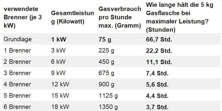 Wie eine Übersicht zeigt, hängt die Nutzungsdauer stark von der Leistung des Grills ab. Wer nur mit einem Brenner grillt, kommt auf gut 22 Stunden. Sobald mehrere Brenner im Einsatz sind, schrumpft die Zeit drastisch: Mit zwei Brennern hält die Flasche nur noch rund 11 Stunden, bei drei sind es etwa 7,4 Stunden. Wer vier Brenner voll aufdreht, kommt gerade einmal auf rund 5,6 Stunden. Bei großen Geräten mit fünf oder sechs Brennern sind sogar nur mehr 4,4 beziehungsweise 3,7 Stunden möglich.