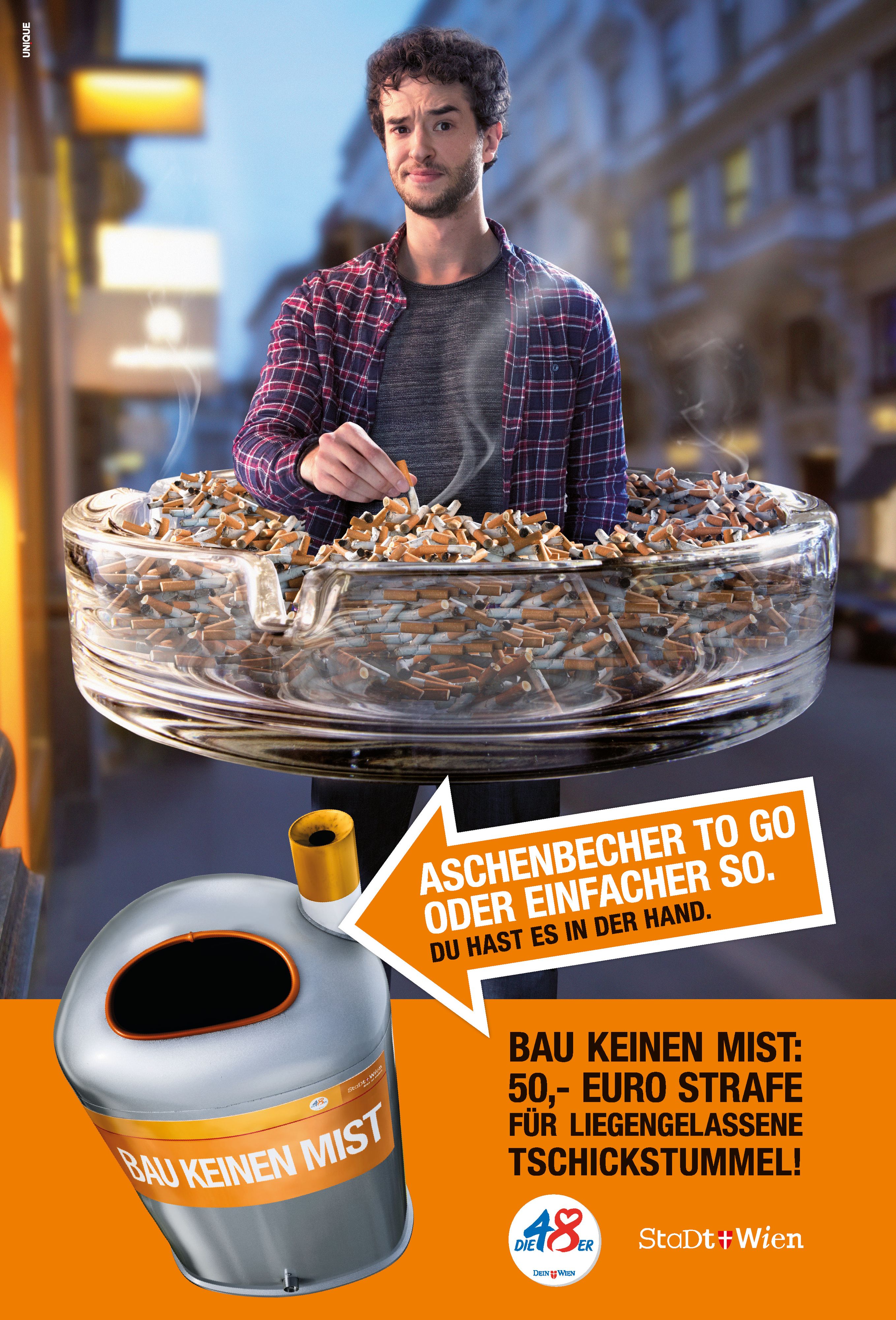 Mit Slogans wie "Hundeklo oder einfacher so" und "Aschenbecher to go oder einfacher so" will die Stadt die Verschmutzung durch Hundekot oder Zigaretten in Erinnerung rufen und Bewusstsein dafür schaffen, wie leicht dies zu vermeiden ist.