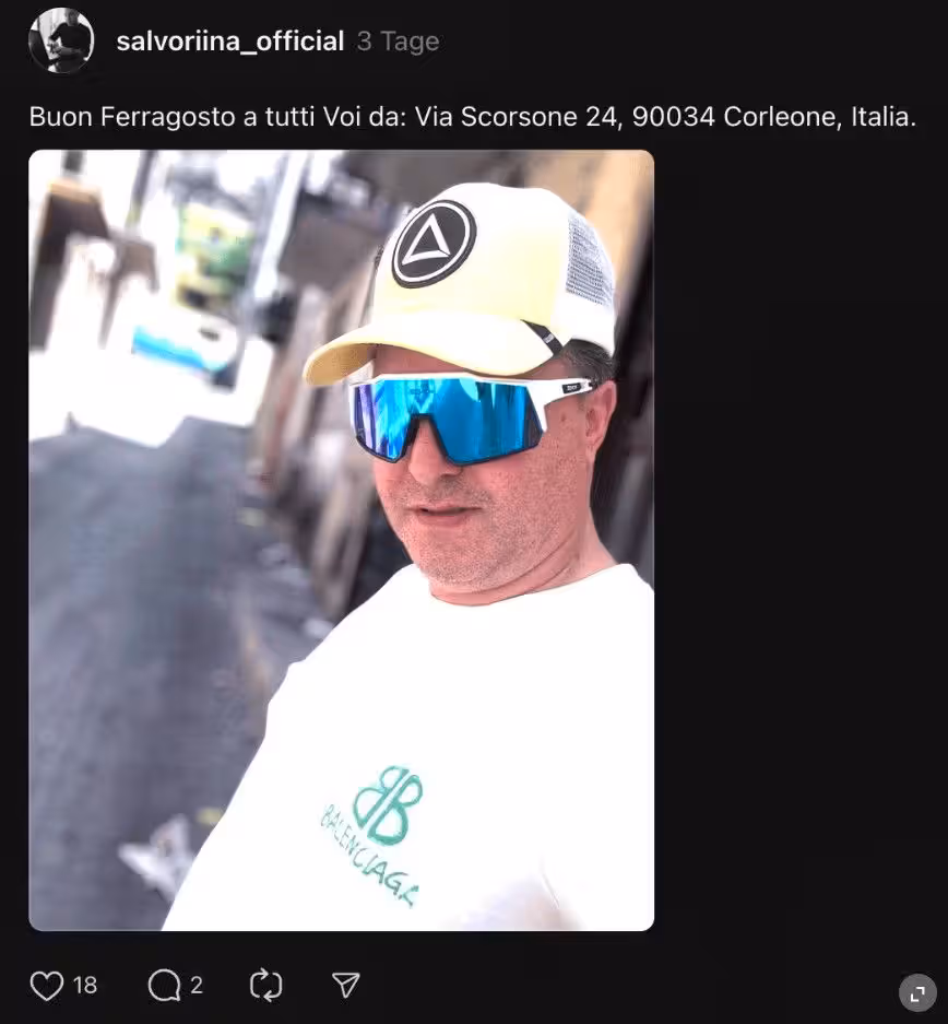 "Schönen Ferragosto euch allen aus der Via Scorsone 24, 90034 Corleone, Italien", lautet der Text zum Bild, das "Salvuccio", der sich nie klar von der Mafia abgegrenzt hat, im weißen Balenciaga-Shirt und mit auffälliger Sonnenbrille zeigt. Für einen Eklat sorgt dabei die Adresse, denn diese existiert seit 2018 in dieser Form nicht mehr.