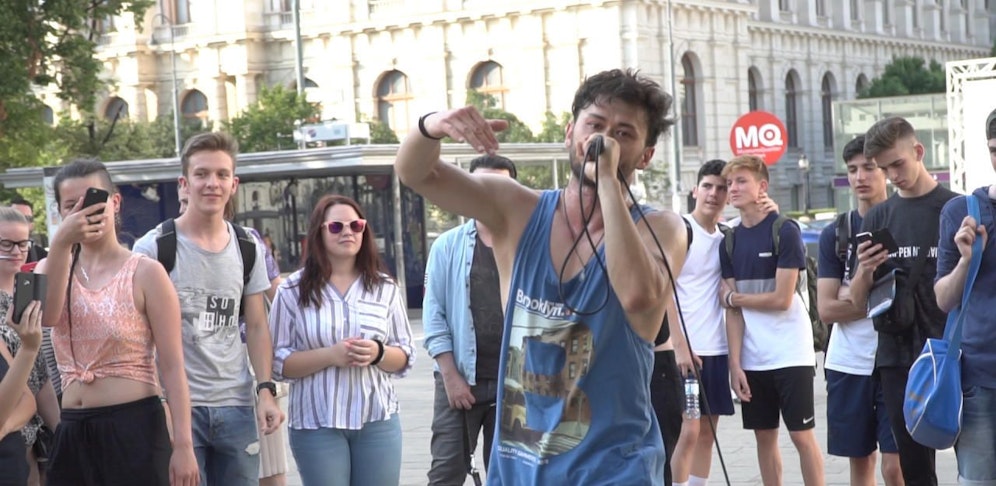 Am Donnerstag Abend spielte Wendja, alias Lukas Plöchl, ein kleines Überraschungskonzert auf einer mobilen Bühne auf der Wiener Mariahilferstraße.
