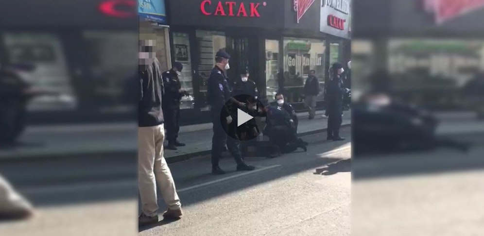 Ein Video eines Leserreporters zeigt, wie ein Mann am Boden von der Polizei fixiert und festgenommen wird. Augenzeugen berichteten, er habe den Sicherheitsabstand nicht eingehalten. Der genaue Grund der Festnahme ist allerdings nicht bekannt.