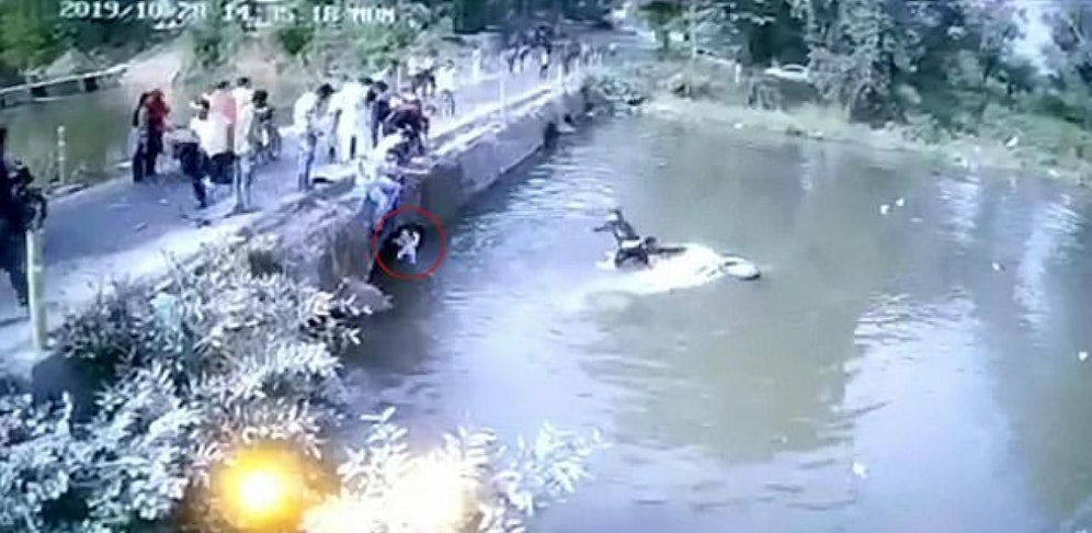 Dramatische Szenen in Indien: Auf einer schmalen Brücke in Madhya Pradesh stößt ein Pkw mit einem Rikscha zusammen. Der Wagen kommt dabei von der Straße ab und fällt in den Fluss.