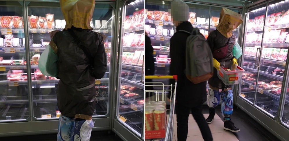 Ein Mann wollte sich anscheinend auf ganz besondere Art vor dem Coronavirus schützen: Mit einem Papiersack auf dem Kopf, in dem zwei Löcher für die Augen ausgeschnitten wurden, einem Müllsack um den Rumpf und zwei Klopapiersackerl um die Beine entdeckte ein "Heute"-Leserreporter den Mann beim Einkaufen.