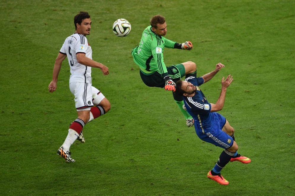 Es war die umstrittenste Szene des Endspiels der vergangenen Fußball-WM. Neuer lief aus dem Tor, um Higuain den Ball abzunehmen. Dabei sprang der Bayern-Keeper aber mit voller Wucht mit dem Knie voran in den Argentinier. Zur Verwunderung aller Beobachter gab der Schiedsrichter allerdings einen Freistoß für Deutschland, anstatt eines Elfmeters für die Südamerikaner.