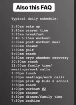 Zweimal jeden Tag schwitzt der Schauspieler insgesamt über 2,5 Stunden im Fitnessstudio, dazwischen holt er seine Kids aus der Schule, zittert sich in der Kältekammer zum besseren Body und findet auch noch Zeit zum Golfen. Arbeitsmeetings, Zeit mit der Familie und genau getimte Snacks und Mahlzeiten bringt er auch noch unter.