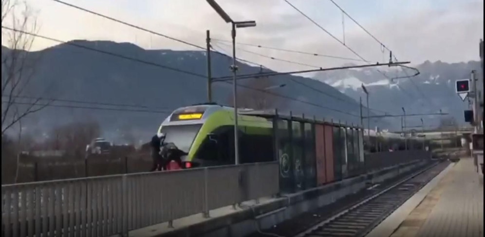 Auf dem Weg von Bozen nach Meran fuhren am Wochenende zwei blinde Passagiere mit. Jedoch saßen sie nicht im Zug, sondern sie hängten sich an den letzten Wagon an. Am Bahnhof winkten sie noch den Passagieren am Gleis, während sie sich lediglich mit einer Hand am Scheibenwischer festhielten.