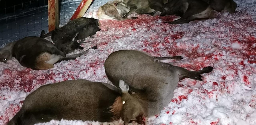 Die Bilder sorgen für Betroffenheit. Hirsche liegen leblos in vom Blut durchtränkten Schnee. Auch die Zaunlatten in der Umgebung sind völlig blutig. Die Tiere mussten einen grausamen Tod gestorben sein.