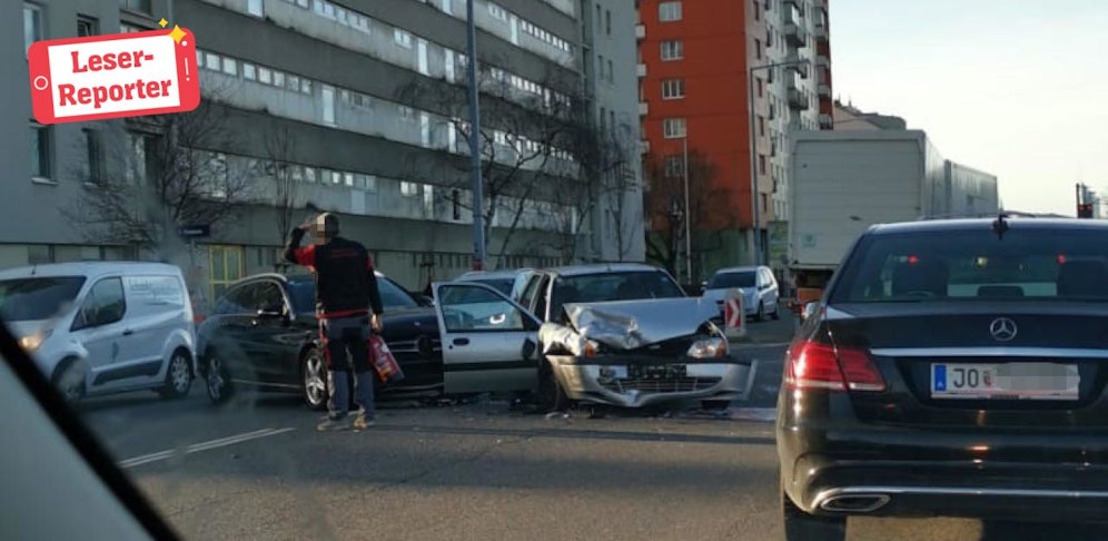 Schwerer Verkehrsunfall in Wien-Leopoldstadt: Der Lenker eines schwarzen Mercedes krachte mit einem silbernen Ford Fiesta zusammen. Nach wenigen Minuten waren bereits die Einsatzkräfte der Berufsfeuerwehr, der Berufsrettung und der Polizei vor Ort. Der Verkehr wurde während des gesamten Einsatzes über Seitengassen umgeleitet.