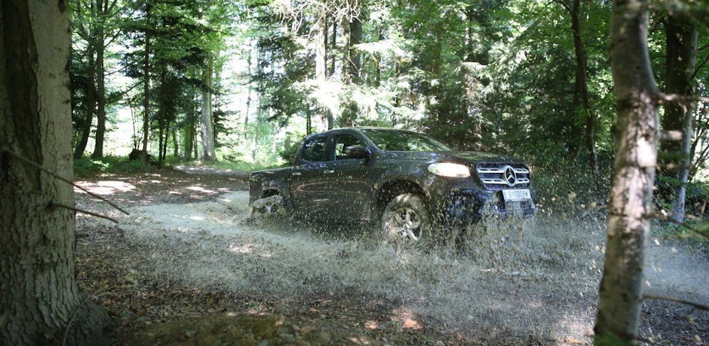 Wie schon gesagt, das Fahrwerk ist wirklich gut: Die X-Klasse liegt hervorragend auf der Straße, man merkt nicht, dass man eigentlich in einem so großen, schweren Fahrzeug sitzt. Es geht flott und gleichzeitig sicher durch die Kurven. Aber der Pick-up ist natürlich auch für den Einsatz abseits befestigter Straßen gedacht – also haben wir ihn mit ins Gelände auf das Areal der Allradmesse in Gaaden bei Wien (31.8. bis 2.9.) mitgenommen.