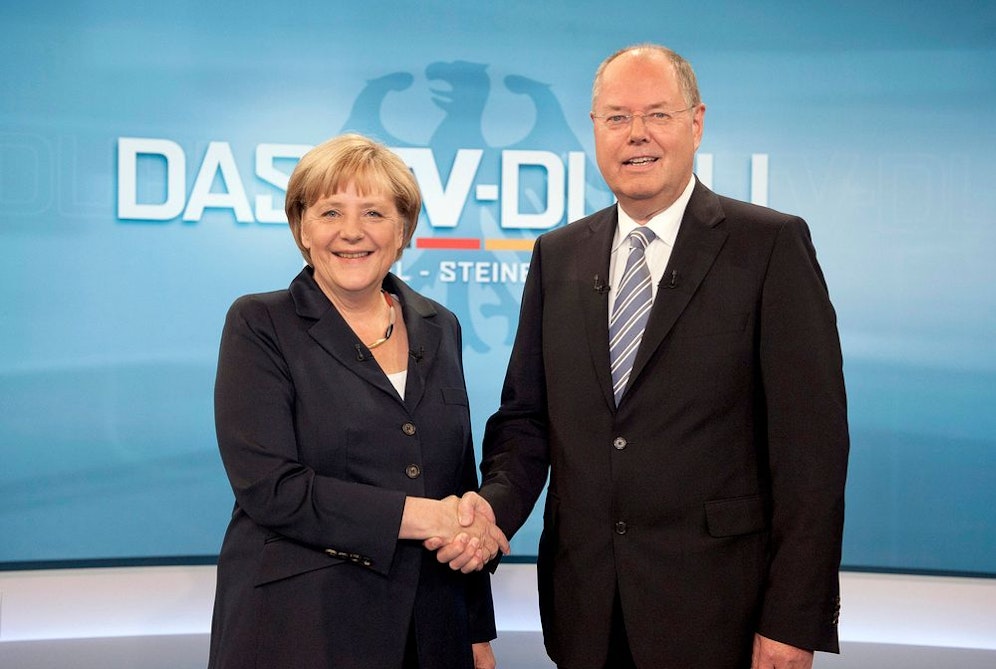 Merkel regiert seit 2009 in einer christlich-liberalen Koalition mit der FDP. Vorher hatte sie vier Jahre lang eine Große Koalition mit den Sozialdemokraten geführt, in der Steinbrück Finanzminister war. In den Umfragen liegen Merkels Christdemokraten weit vor Steinbrücks Sozialdemokraten. Für die Regierungskoalition insgesamt ergab sich zuletzt ein hauchdünner Vorsprung vor der Opposition aus SPD, Grünen und Linkspartei.