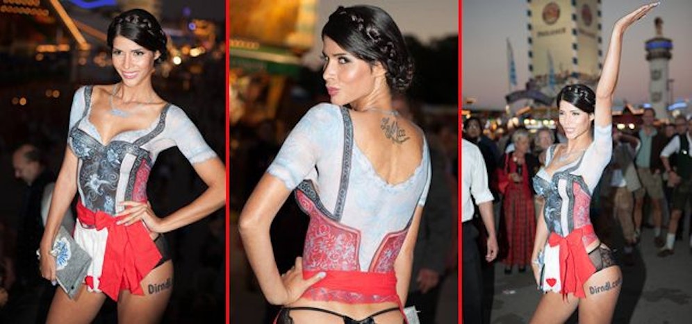 Auf den ersten Blick wirkt Promi-Luder Micaela Schäfer überraschend angezogen. Auf den zweiten offenbart sich jedoch ein ganz anderes Bild. Schäfers Dirndl ist nämlich nur gemalt!