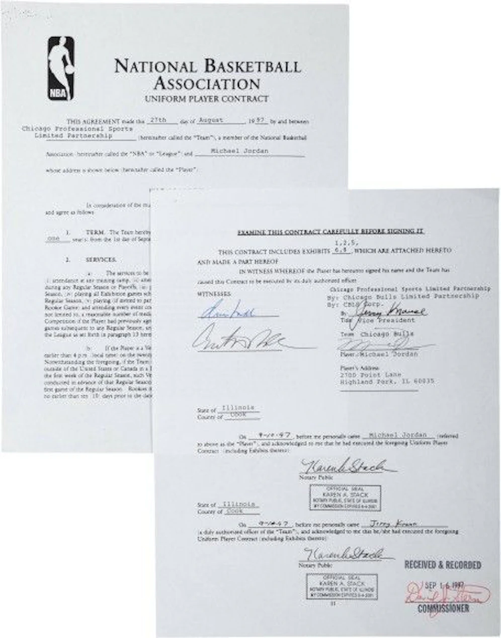 Jordan unterzeichnete das 26 Seiten lange Dokument anno dazumal für die Saison 97/98 bei den Chicago Bulls. Der Basketball-Star verhalf der Mannschaft in dieser Saison dann auch entscheidend zum Gewinn der Meisterschaft.
