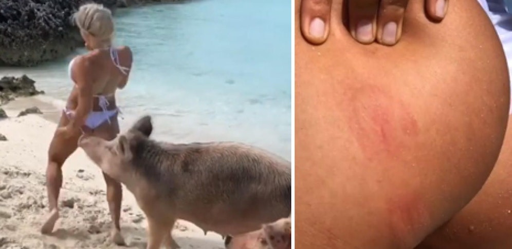 Doch entweder glaubt das Muttertier, ihre Jungen seien in Gefahr, oder Michelles Apfel-Hintern kann sogar ein Schwein verführen. Was auch immer es war, es endete damit, dass die Schweine-Mama dem Model einen Liebesbiss am Hinterteil zukommen ließ.
