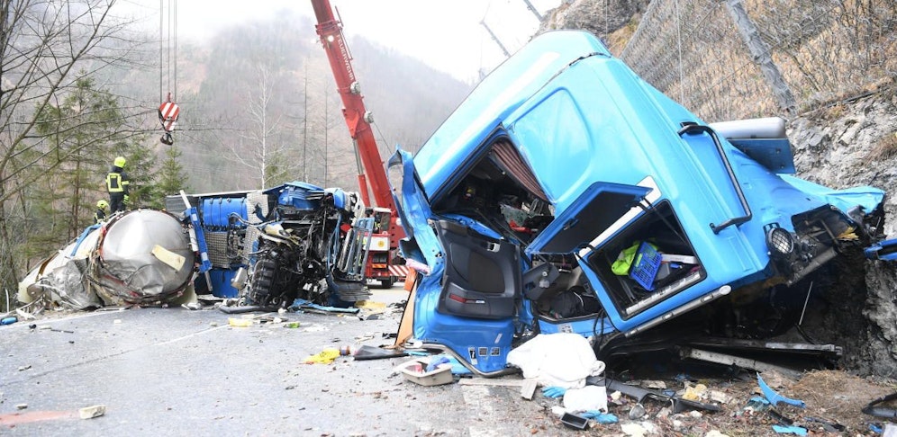 Montagvormittag prallte auf der B115 im Bezirk Steyr-Land ein mit Milch beladener Lkw gegen eine Felswand. Der Lenker (46) verstarb noch an der Unfallstelle.