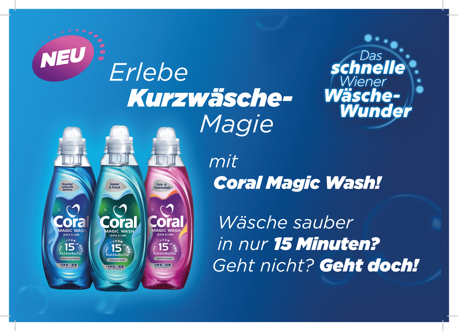 Teste das neue Coral Magic Wash beim exklusiven Coral Launch-Event "Das schnelle Wiener Wäsche-Wunder". Coral und HEUTE verlosen 4x2 Eintritts-Tickets.