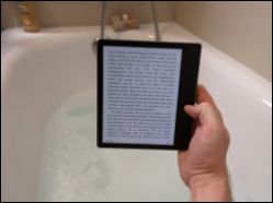 Ein noch stärkeres Argument ist aber das Gehäusedesign und die Wasserdichtheit (IPX8). Es ist Amazons erster wasserfester Kindle. Zwar liegt das Gerät dank der dickeren rechten Geräteseite sicher in der Hand, sollte er aber doch einmal aus den Fingern rutschen, übersteht er auch ein Vollbad. Das macht ihn nicht nur perfekt für die Badewanne, sondern auch für den Pool- oder Strandaufenthalt. Übrigens: der "Oasis" erkennt, ob er mit der rechten oder linken Hand gehalten wird und stellt die Seiten am Bildschirm automatisch korrekt dar. Ein Segen auch für Linkshänder.