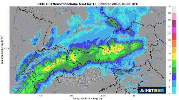 Vom Bregenzerwald bis zum Semmering kommen bis Dienstagabend oberhalb von 500 m verbreitet 20 bis 40 Zentimeter Neuschnee hinzu, lokal sind bis zu 60 Zentimeter möglich. In Kombination mit dem stürmischen Nordwind steigt dadurch die Lawinengefahr wieder deutlich an.