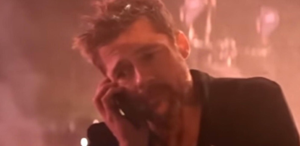 Der 53-jährige Schauspieler sitzt traurig am Bühnenrand und telefoniert, während Frank Ocean R&B-Balladen singt. Alles zu sehen auf der LED-Leinwand.