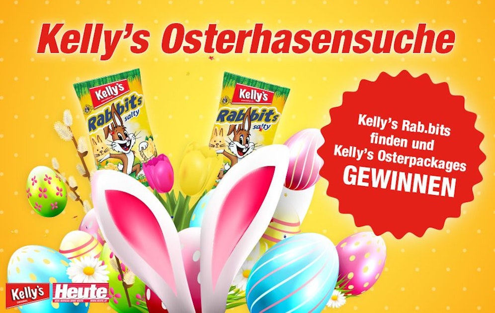 Osterhasensuche mal ganz anders: Von 20. März bis 10. April haben wir fünf Kelly?s Rab.bits Packungen auf unserer Website versteckt und verlosen unter allen Lesern zehn Kelly?s Osterpackages gefüllt mit Kelly's Snacks!Mach dich auf die Suche nach den fünf versteckten Kellys Rab.bits Packungen auf Heute.at und mit etwas Glück gehört eines der köstlichen Kelly?s Osterpackages bald dir! Viel Glück bei der Suche!