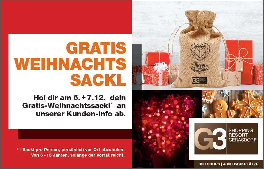 Am 6. und 7. Dezember können Kinder von 6 bis 13 Jahren im G3 tolle Überraschungen bei den teilnehmenden Shops in ein Weihnachtssackl "einsacken". Zusätzlich sorgt der Besuch vom Nikolo am 6. Dezember für eine besondere Bescherung. Von 10 bis 18 Uhr kann man den Nikolo beim Eingang B treffen!