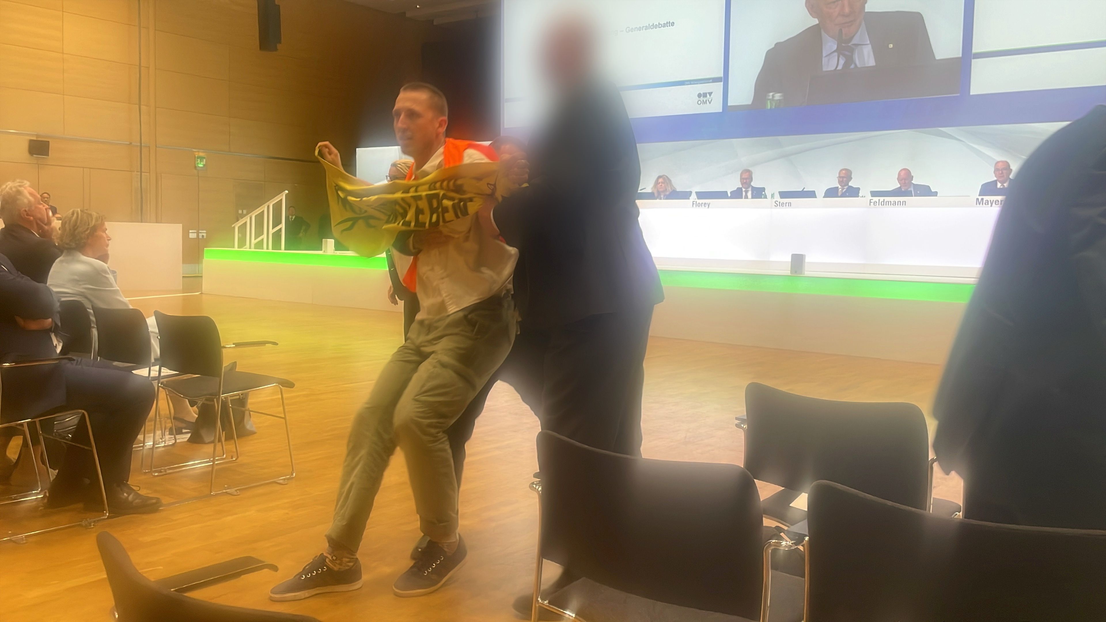 Erst wilde Beschimpfungen, dann brutaler Abflug: Aktivisten der "Letzten Generation" drangen in die Wiener Messe bis zur Hauptversammlung der OMV vor und beschimpften dort Vorstand und Aktionäre: "Ihr seid die Mörder eurer Enkel!". Beim Versuch, mit einem Banner auf die Bühne zu gelangen, wurden sie aber von Sicherheitskräften festgehalten und aus dem Gebäude gedrängt. Mit unter den Protestierenden: Ex-Ski Profi Julian Schütter (26), Volksschullehrerin Bianca Müller (29). Ihre Botschaft: Es klebe Blut an den Händen der Anwesenden.