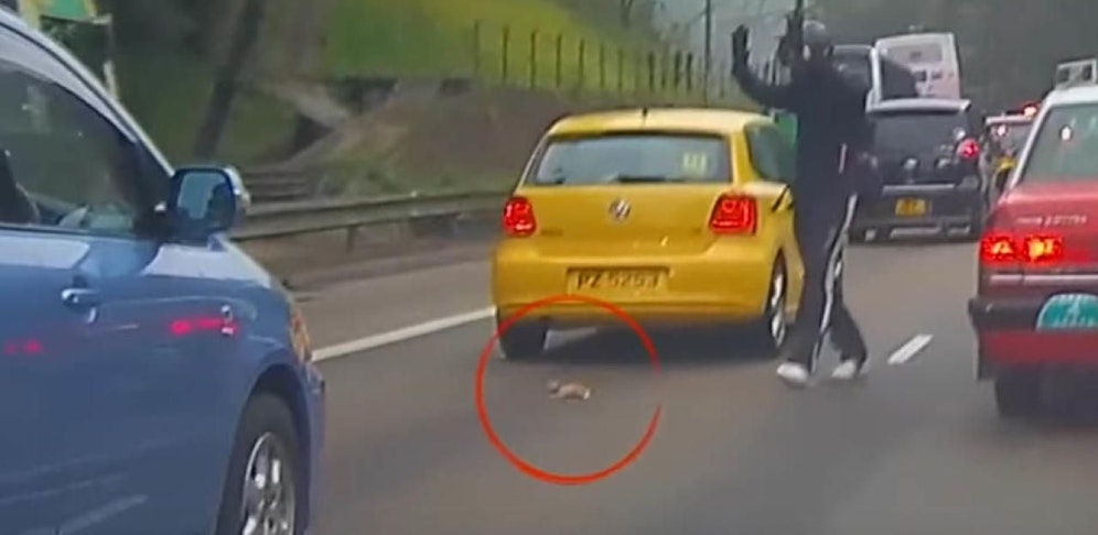 Kwok Kin Wai war mit seinem Bike gerade auf einer dicht befahrenen Straße unterwegs, als er mitten auf der Fahrbahn ein Katzenbaby entdeckte. Der Stubentiger lag völlig verängstigt auf der Straße und rührte sich nicht vom Fleck. Mehrere Autos verfehlten das kleine Tier nur knapp.