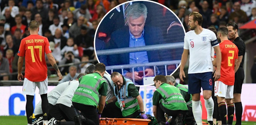 Ganz England war in der 46. Minute schockiert! Luke Shaw ging nach einem Zweikampf mit Dani Carvajal in der Nations League zu Boden und musste minutenlang behandelt werden. Nur seinen Vereinstrainer bei Manchester United schien das nicht zu interessieren. "The Special One" tippselte lieber auf seinem Handy herum.