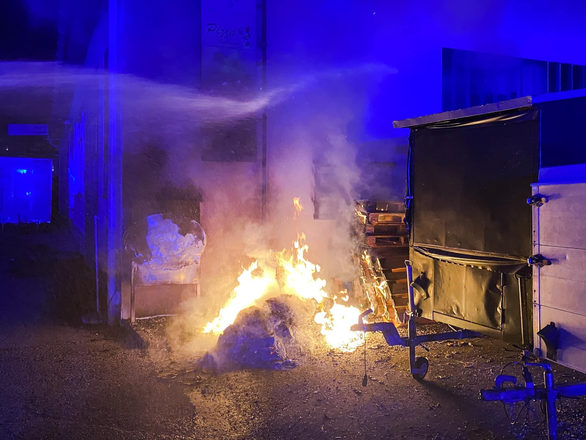 Kurze Zeit später wurden die Löschkräfte gegen 04:20 Uhr zu einem weiteren Einsatz beordert. Ganz in der Nähe brannten plötzlich Dabei handelte es sich um brennende Holzpaletten vor einem Firmengebäude sowie um einen in Flammen stehenden Papiercontainer vor einem Wohnhaus.