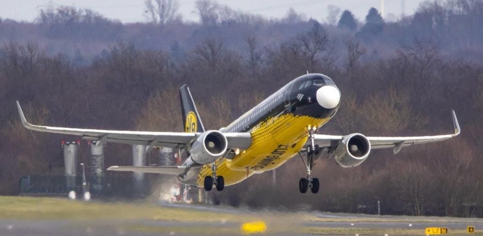 Die Schalker mussten im Airbus mit dem Aufdruck von Erzrivalen Borussia Dortmund fliegen. Eurowings erklärt: "Ein ganz normales Linienflugzeug unserer Flotte."